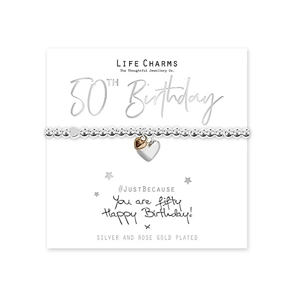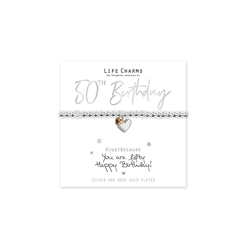 - Pure silver and rose gold plated puffed heart charms on a 5mm beaded stretch bracelet. The bracelet comes presented in a luxury gift box, with a Just Because 'You Are 50' card. All jewellery is finished to the highest standard & E-coated to prevent any tarnishing.