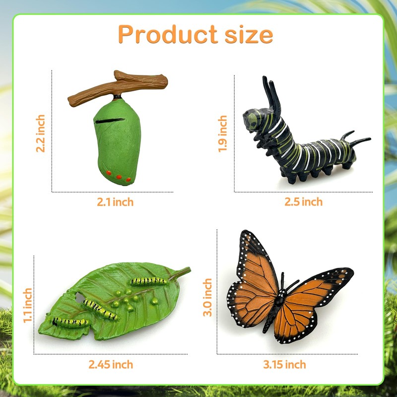 - 【Life Cycle Leaning Toys】Kids can see how Butterfly & Frog change and grow. Contains 2 Sets of Plastic Insect Animals Including Monarch Butterfly, Frog, Which includes 1 Monarch butterfly, 1 chrysail, 1 caterpillar, 1 leaf with eggs, and eggs,Tadpole,Tadpole withou Gills,Tadpole with legs,Frog. It is the best animal toy set for kids to learning.