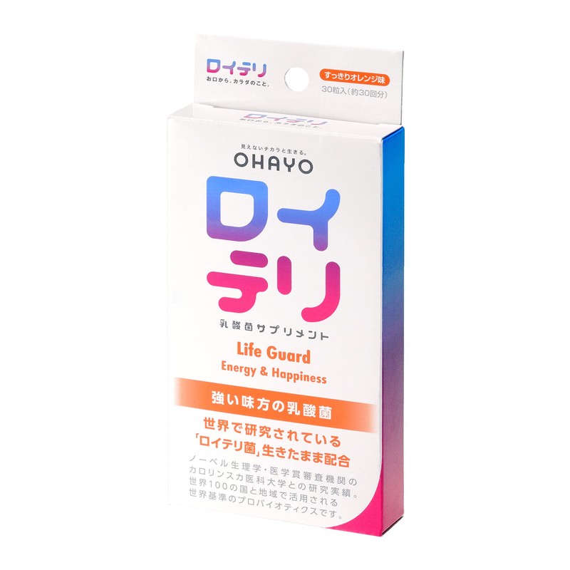 お口からカラダの健康を考える、新感覚の菌活サプリメント。アクティブなカラダで、人生を強く豊かに過ごす。生きたロイテリ菌をお口から、カラダへ。年齢とともに気になるお悩みを支えます。 ●砂糖不使用・歯磨きの後にもお召し上がりいただける成分で、飽きのこないすっきりオレンジ味です。いつでもお好きな時に健康習慣としてお召し上がりください! ●ゆっくりとお口のなかで舐め溶かすトローチタイプで、生きたロイテリ菌がお口全体に広がります。 ●生きたロイテリ菌(L.reuteri DSM17938株、L.reuteri ATCC PTA 6475株)を合計2億個以上含有しています。ロイテリ菌はヒト由来で、生きて腸まで届く、プロバイオティクスの条件をすべて満たした乳酸菌です。
