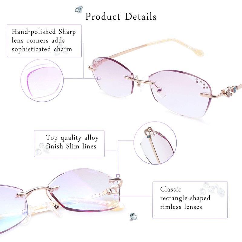 - Classic rimless frame design, ultra-lightweight, no pressure on your face and ears, durable with sturdy alloy frame.