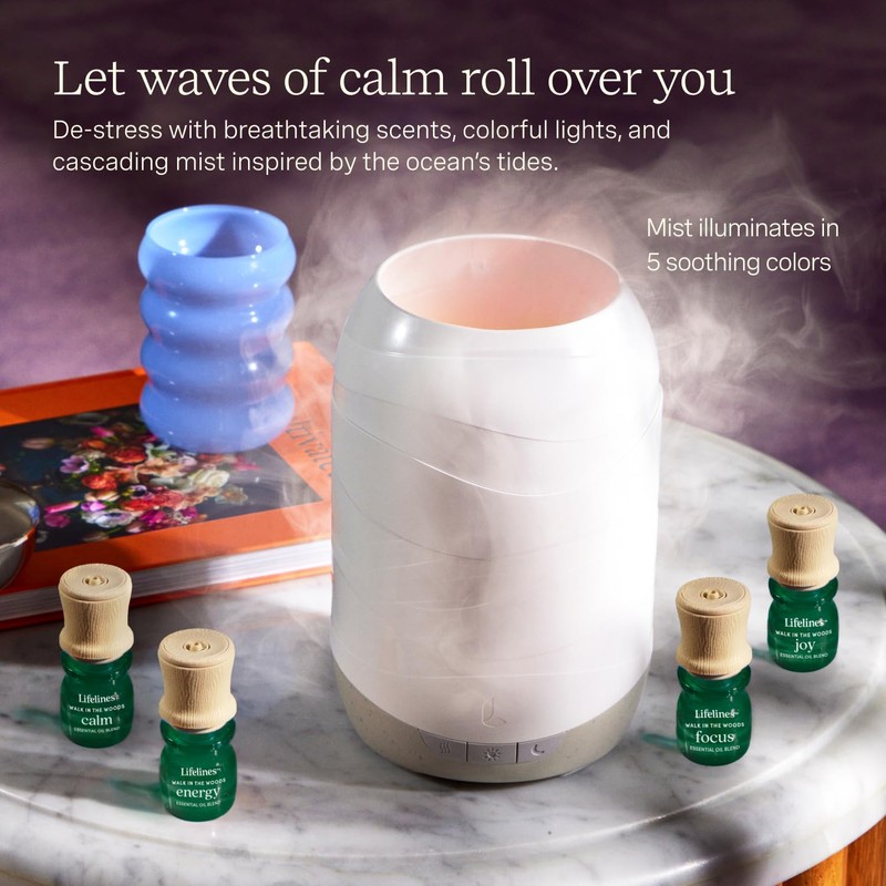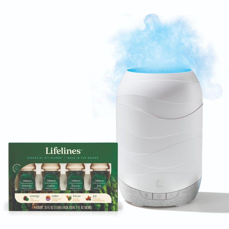 Lifelines 200 ML Waves Ultrasonic Diffuser with Cascading Mist + Walk in The Woods 4-pack - 100% Pure Essential Oils & Sustainably Sources Botanicals - Natural - 7.5 ML Bottles