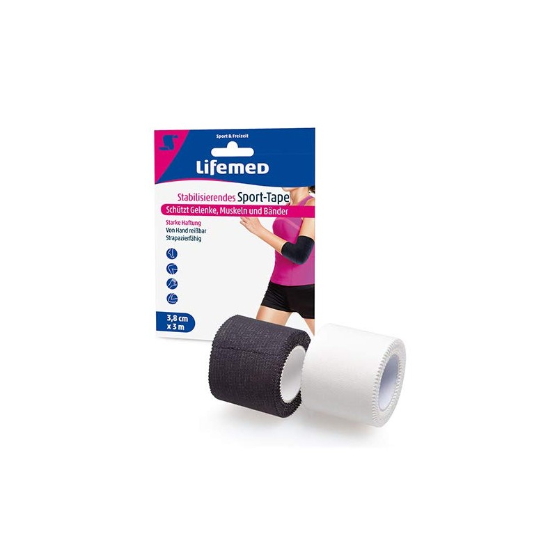 Lifemed - Stabilising Sports Tape 3 m x 3.8 cm Black / White - Protects Joints, Muscles and Ligaments, Pack of 3 (3 x 1 Item)