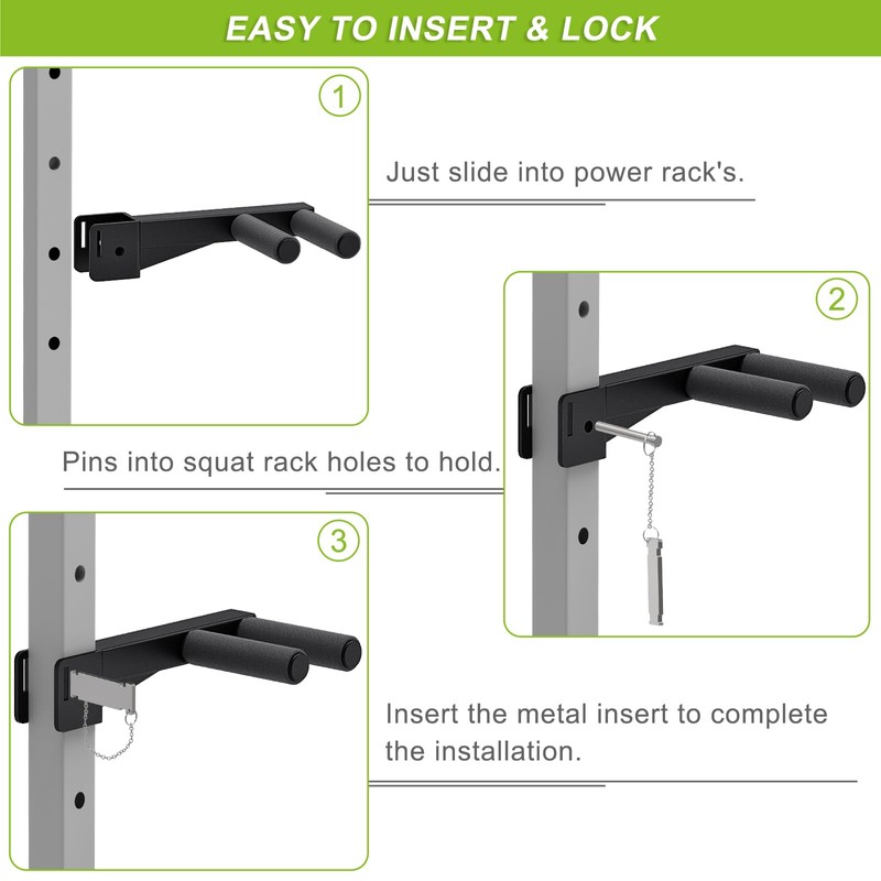 - 【EASY TO INSTALL AND ADJUST】Simply put in the power rack, the pins are inserted into the holes of the squat rack to secure it, and lock with metal inserts. Easily adjust the height and position of the dip bars according to your preference and exercise, make the most of your exercise time