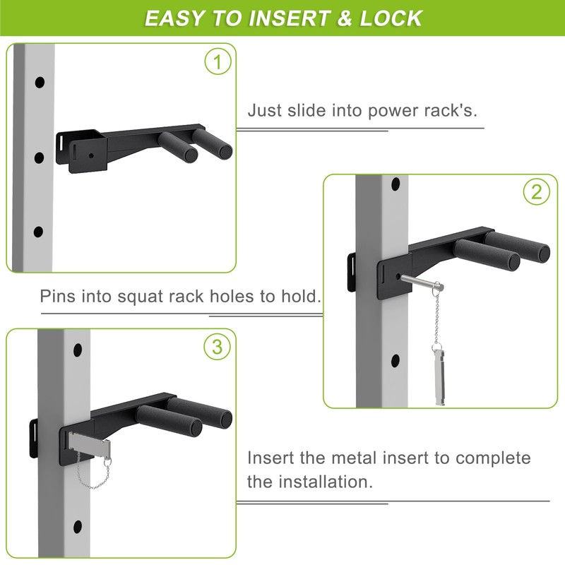 - 【EASY TO INSTALL AND ADJUST】Simply put in the power rack, the pins are inserted into the holes of the squat rack to secure it, and lock with metal inserts. Easily adjust the height and position of the dip bars according to your preference and exercise, make the most of your exercise time.
