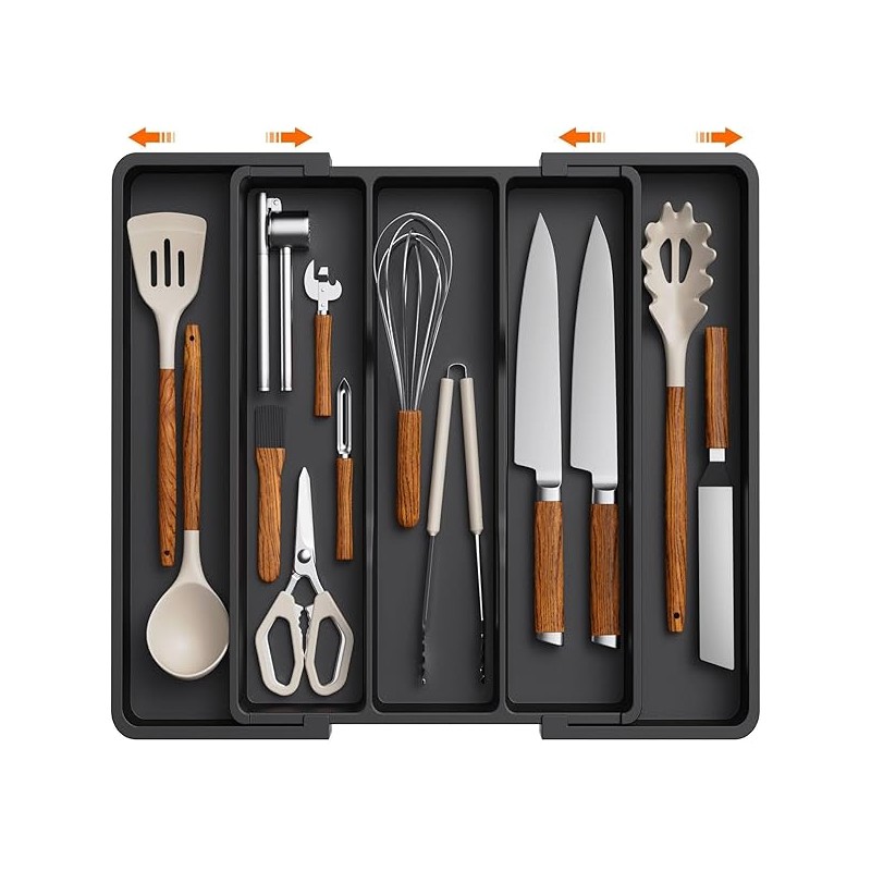 Lifewit Utensil Organizer for Kitchen Drawers, Expandable Cooking Utensil Tray, Adjustable Cutlery Silverware Flatware Holder, Plastic Kitchen Spatula Tools and Gadgets Storage Divider, Large, Black