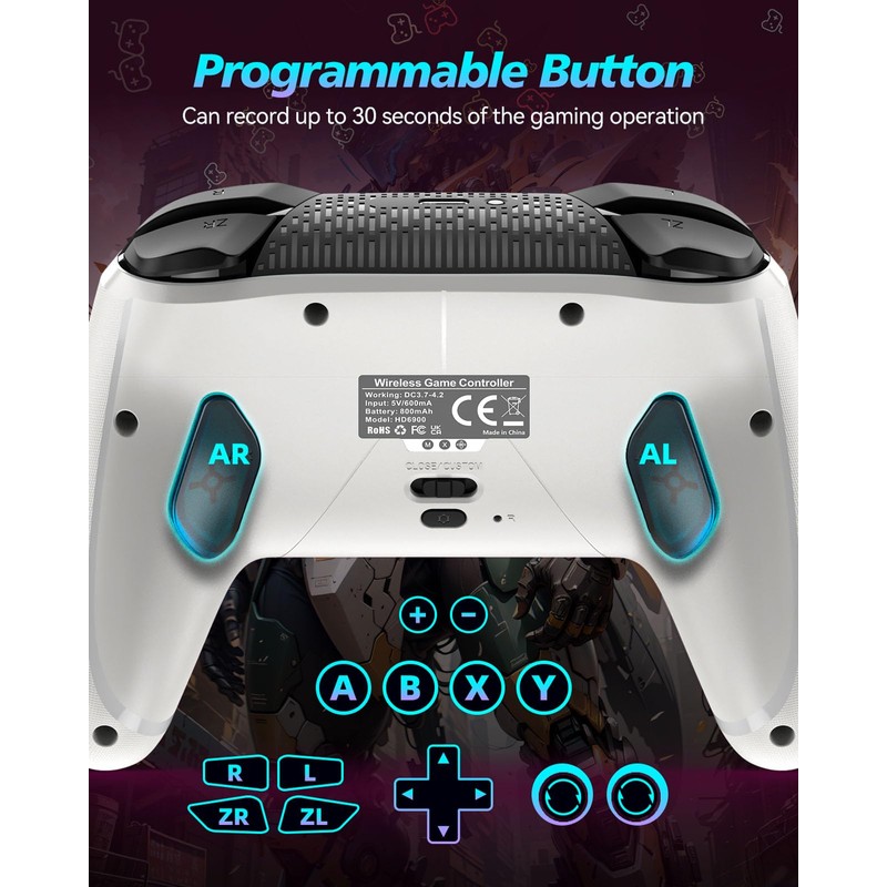 • [Programmable Functions]: Bluetooth Game Controller with 2 programmable buttons, AR/AL= A+B+Y+L+ZL+R+ZR+D-pad and records up to 30 seconds of game action, Pro Controller Switch with Programmable Buttons helps to minimise button abuse, Mobile Controller with ABXY Function Switch to freely switch between Nintendo Switch layouts and Xbox layouts.