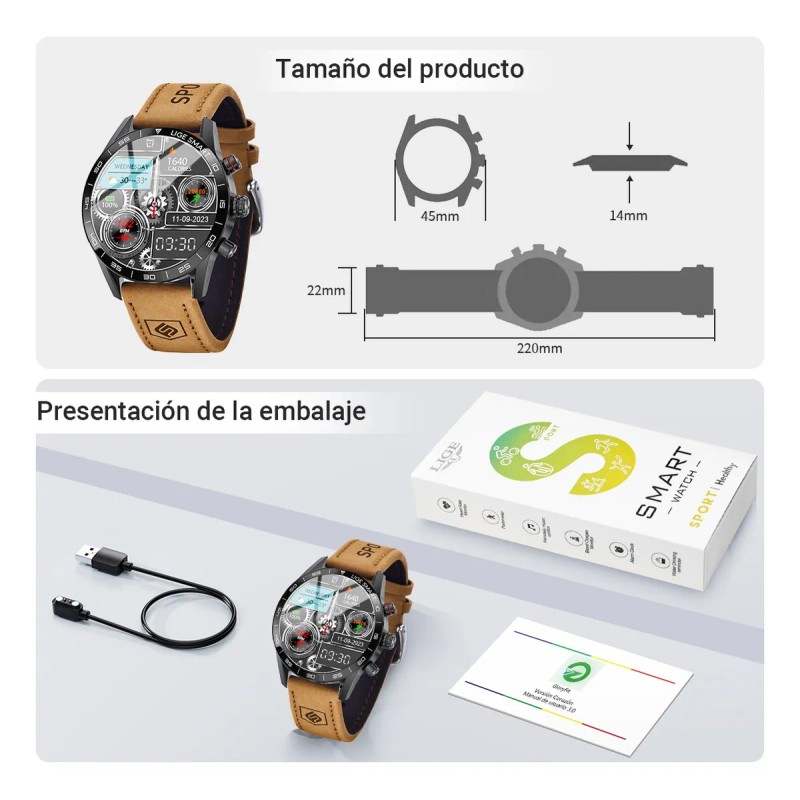 Configuración inicial: Enciende el reloj y sigue las instrucciones en pantalla para emparejarlo con tu smartphone mediante Bluetooth.