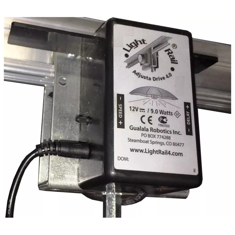 Includes an LR4 AdjustaDrive Robotic Motor, Switch Stop stoppers, adjustable speed of 2 to 4 feet per minute, adjustable settings for travel distance and 0-60 sec adjustable time delay. Light Rail 4.0 AdjustaDrive works with 110-240v, compatible with all countries electrical, uses only 9 watts. No Rail included.