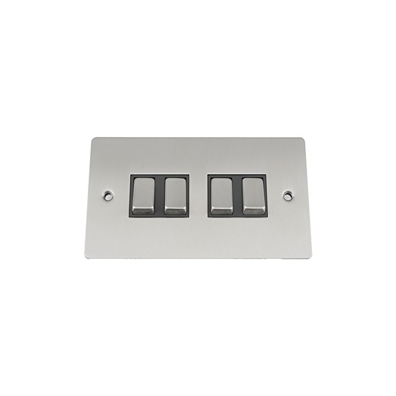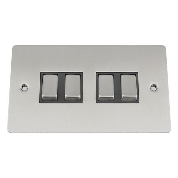 Light Switch 4 Gang - Satin Matt Chrome Flat - Black Insert - Metal Rocker Switch - 10 Amp 4 Gang 2 Way