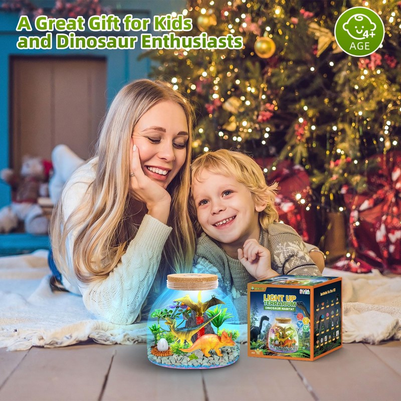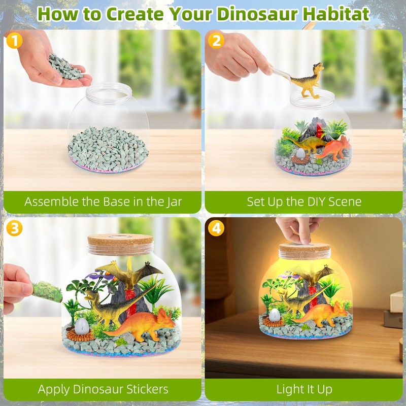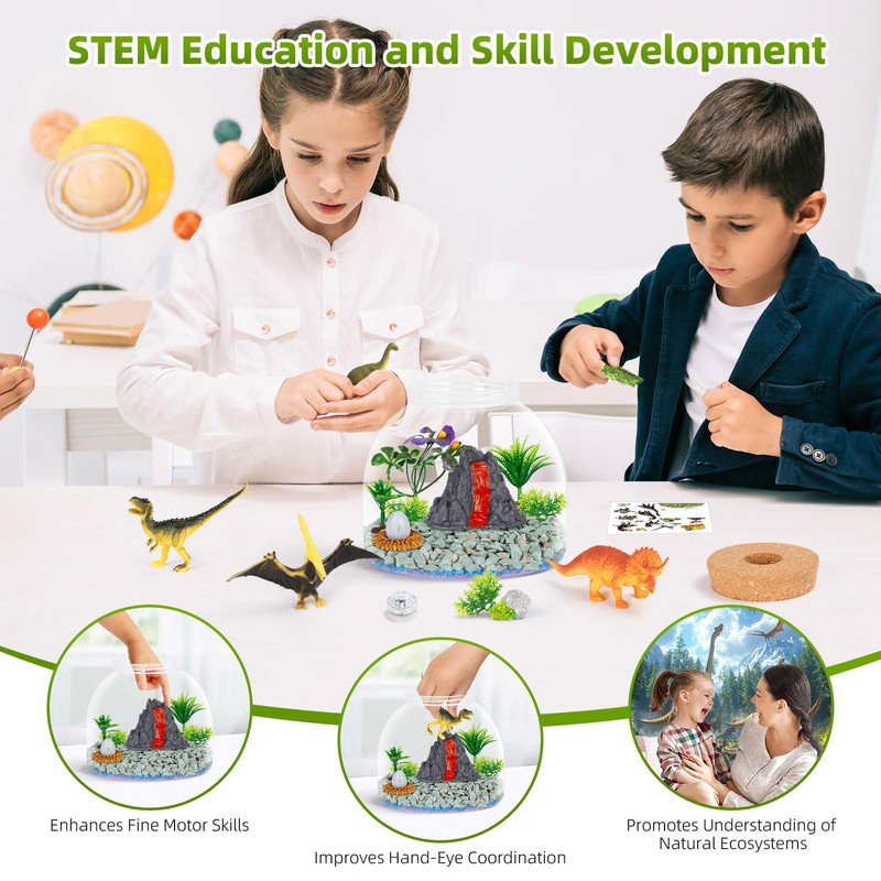 - Create a Dinosaur Habitat: Let your child's imagination soar as they build their very own dinosaur habitat. This kit includes everything needed to create a realistic prehistoric scene, complete with dinosaur figures, volcano, artificial plants, decorative stones, colorful gravel, and dinosaur-themed stickers to decorate the terrarium