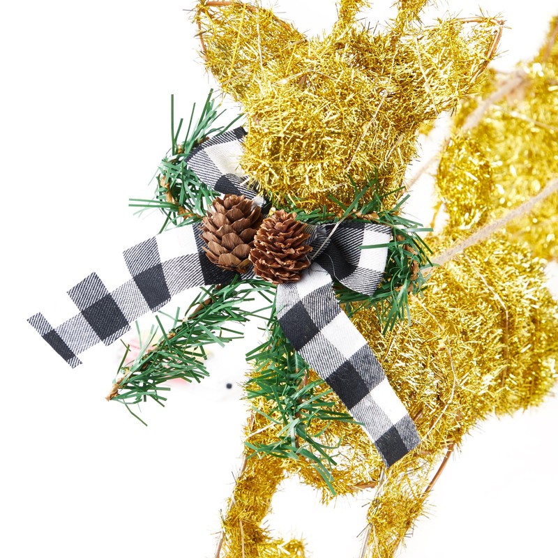 - Festive Holiday Charm: Elevate your decor with this reindeer sleigh, featuring a Christmas elk wrapped in shimmering gold twine. Its eye-catching design radiates festive joy, perfect for indoor or outdoor displays. Create a magical Christmas atmosphere