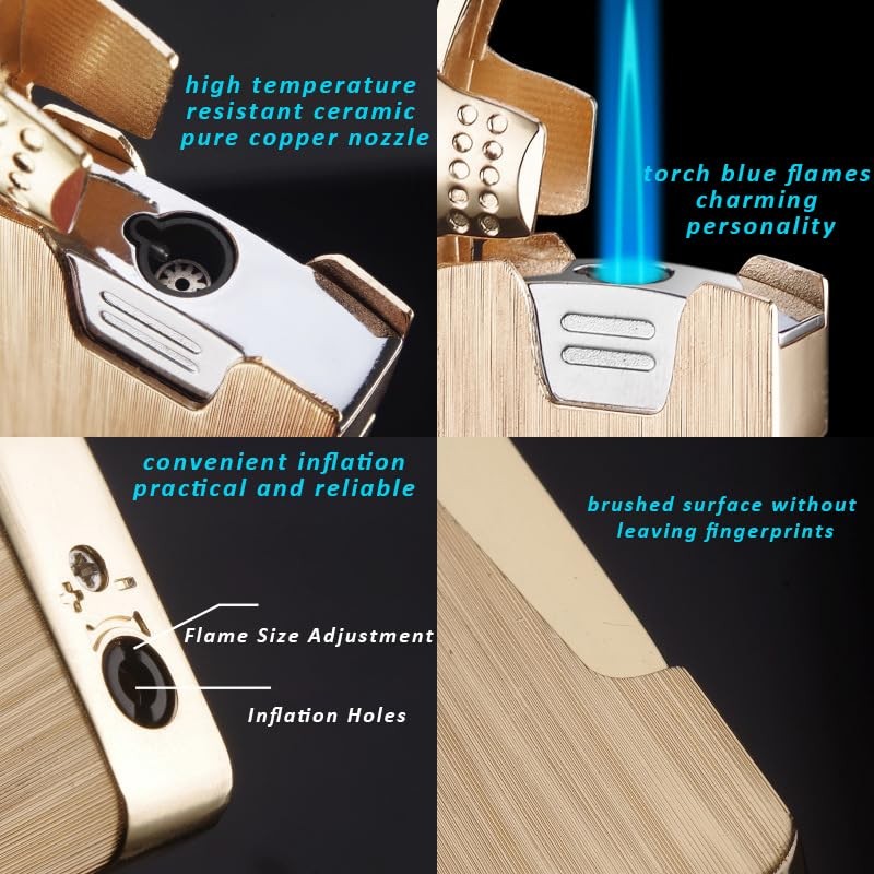 - 【Strong Jet Flame Butane Lighter】This torch lighter gives you powerful high-pressure jet flame. There are many advantages for dual jet flame lighter, it can light wood or charcoal much easier. You should need it when you grill steaks with your friend in camping. Also it has better performance in windproof.