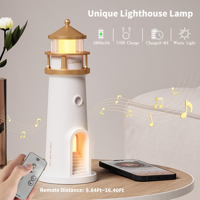 • NIGHT LIGHT WITH BLUETOOTH SOUND: The lighthouse table lamp is equipped with Bluetooth sound, wireless Bluetooth sound connects through your cell phone to play your favorite music anytime, anywhere. Moonlight lighthouse is very suitable for ambient light, cozy warm light, romantic music, dreamy moonlight projection, easily create a peaceful and romantic atmosphere.