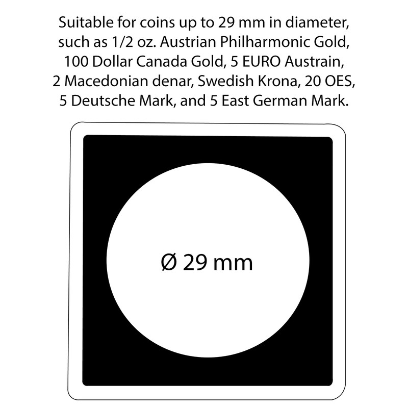 - The identical outer dimensions of the square capsules allow coins of different sizes to be stored in a single collectors’ system. Square coin capsules made from high-quality, scratch-resistant plastic. Secure yet easy-to-open locking. Capsules incl. precise-fit black insert for all the most common coins with a 14 - 41 mm diameter. Capsules available in mm increments. Capsule size: 50 x 50 x 6.25 mm. , RLO (sales unit): 10 item