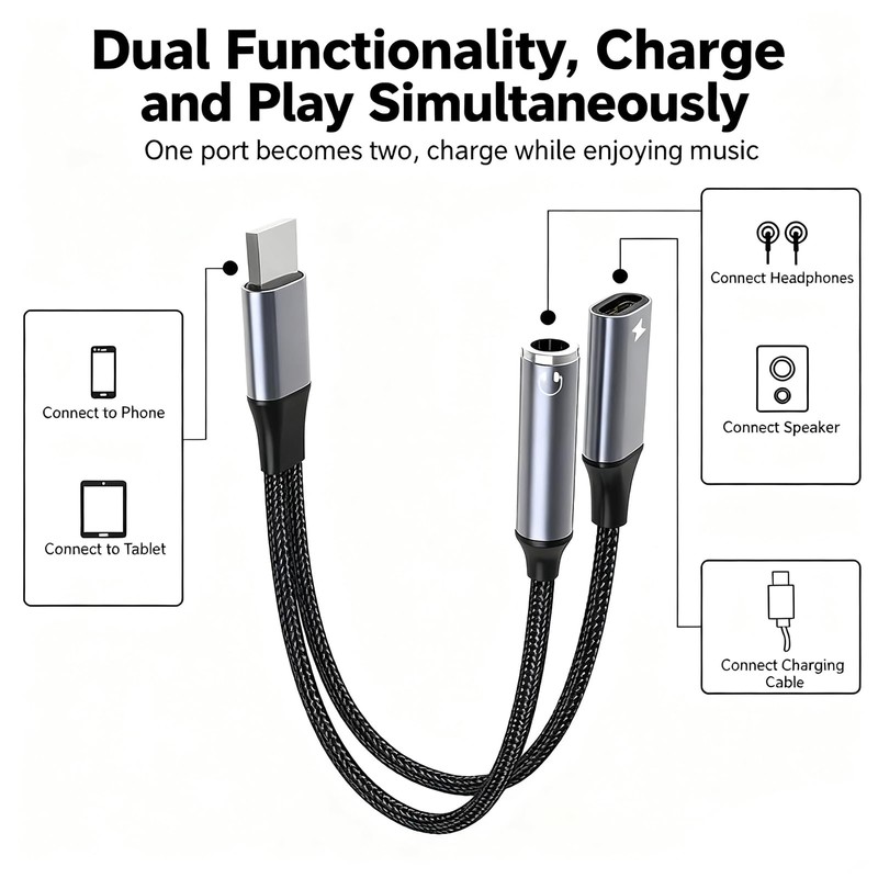 - ♪♪【2-in-1 Lighting to 3.5mm Adapter】This phone splitter for charging and headphone use converts the phone's lighting port into a charging-compatible lighting port and a 3.5mm audio jack. It lets you listen to music or make phone calls while fast-charging your device, and this phone adapter for headphone jack delivers high-fidelity audio and supports PD 27W fast charging. You can fully immerse yourself in the audio world without worrying about your phone's battery running out. Note: Data transfer is not supported.