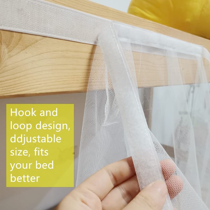 - Product Feature: Fine holes polyester mesh curtain with self-adhesive hook and loop design, easy to apply and remove. Coverage can be adjusted to fit your bed perfectly, no sagging and no gap betweeon panel top and bed frame. Easy to install and remove by one person