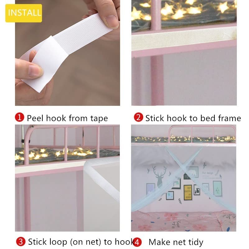 - Tips: If you move frequently, we advise you cut the hook into 10cm/ 4in pieces and spread the pieces onto bed frame or ceiling, then stick the netting to hooks. So you will have loop for later use