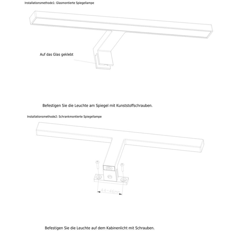 - Praktisches Design mit 2 Montagem?glichkeiten fr diese Spiegelfrontleuchte. Dank der mitgelieferten Befestigungsklammer kann diese Spiegelleuchte an Schr?nken befestigt werden,auch als Befestigungsleuchte direkt am Spiegel. Mit dem integrierten LED-Modul l?sst sich diese LED-Badezimmerspiegelleuchte schnell und einfach installieren, ohne dass ein zus?tzlicher Transformatoranschluss erforderlich ist.