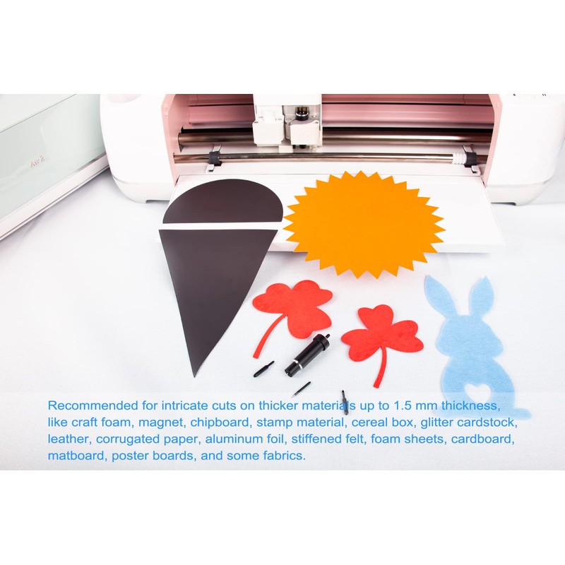 • Recommended for use with: for intricate cuts on thicker materials , like craft foam, magnet, chipboard, stamp material, cereal box, glitter cardstock, leather, corrugated paper, aluminum foil, stiffened felt, foam sheets, cardboard, matboard, poster boards