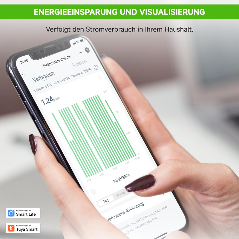 - MEASUREMENT OF POWER CONSUMPTION: Monitor power consumption via Tuya Smart/Smart Life mobile app as a basis for assessing electricity costs.