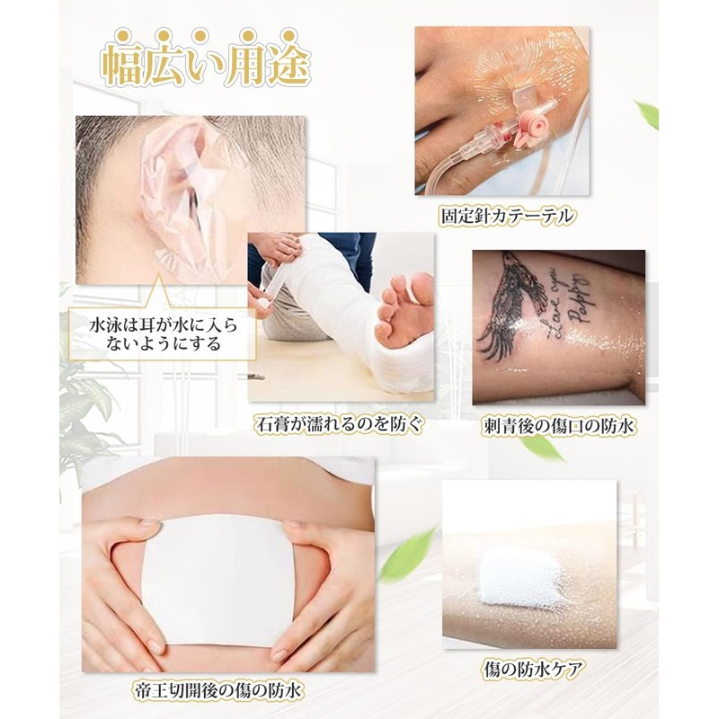 - 【使うシーンが多い】肌に防水できるなので、お風呂の時、水泳、雨に濡された時に必要になります。普通の怪我された傷口への保護だけではなく、帝王切開の出産後のキズに防水、タトゥー(入れ墨)した後の肌に対しての防水介護にもよく需要される実用性持たれています。大人と子供、また老人にも無差別適用です。