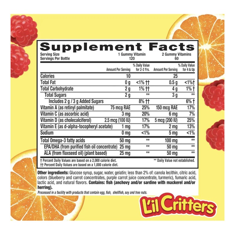 🌟🐻 ¡El mejor aliado para el desarrollo saludable de tus peques! 💪🧠 Las Gomitas Lil Critters Omega 3 para niños ofrecen un delicioso sabor frutal 🍓 y una fórmula rica en ácidos grasos esenciales DHA y EPA, fundamentales para fortalecer el cerebro, la vista 👀 y el sistema inmunológico 🛡️. Con 120 gomitas, tendrás hasta 4 meses de apoyo diario para que tus hijos crezcan fuertes, inteligentes y felices 🎉🌈. Sin gluten, sin colorantes artificiales y sin pescado fuerte 🐟🚫, ¡solo sabor y salud en cada mordida! 🍬✨
