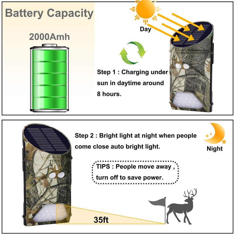 This easy to use light has an on board 2000mAh rechargerable battery and its built in Solar panel makes it self sufficient. Activated by motion, the moonshine light can also be a great security addition to your house or camp. With the help of its 20 high Intensity Red LED lights, the green light is sure to light up the night.
