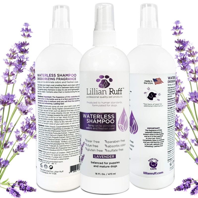 Lillian Ruff Waterless Dog Shampoo - No Rinse Quick Dry Shampoo Spray for Dogs and Cats - Tear Free Lavender Coconut Scent to Deodorize Pet Odor and Freshen Coat - Made in USA (Lavender 16oz)