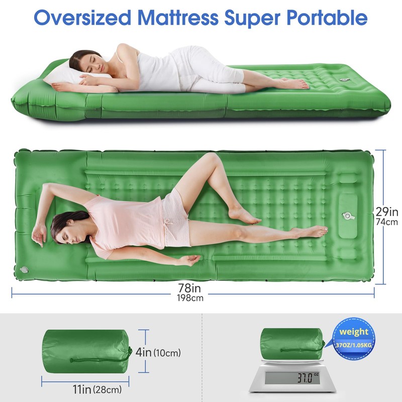 - 【Oversized Mattress Super Portable】The width is increased by 78*29 inches, so air mattress is suitable for lying on the back, side and abdomen, which can satisfy your arbitrary sleeping position. At the same time, the folded sleeping mat is only 11 * 4 inches, which can be carried in your backpack at will without occupying any space.