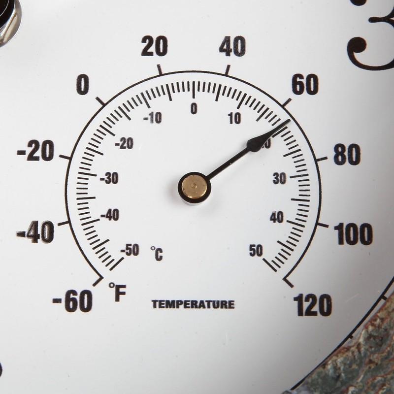 - BUILT IN THERMOMETER AND HYGROMETER: This Hanging Wall Clock has been designed with a built-in thermometer and hygrometer. The thermometer can measure temperatures from -40 to 140 degrees Fahrenheit while the hygrometer can measure humidity from 0% to 100%. This piece is great for outdoor use in the garden, backyard, or by the pool!