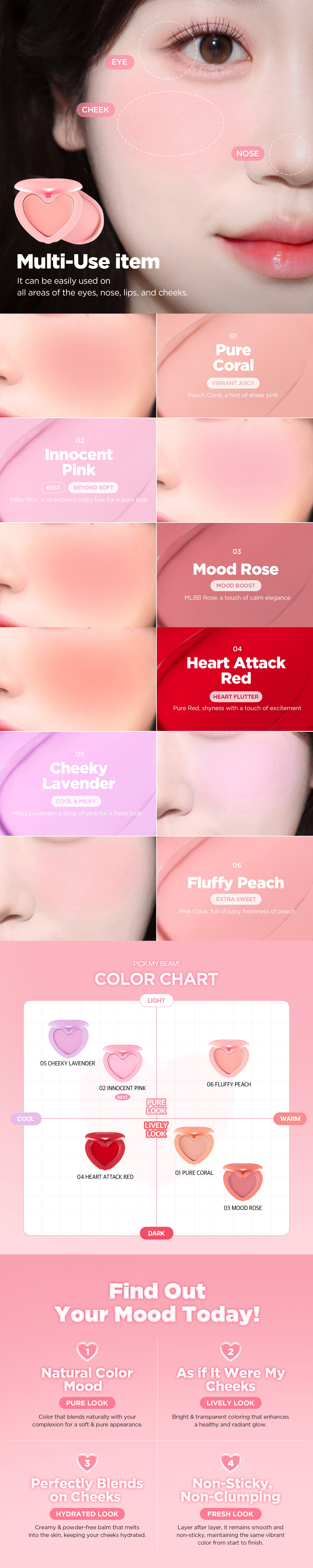 - Ingredients: #01 Cheongcho Beam Triethylhexanoin, Macadamia Seed Oil Polyglyceryl-6 Esters Behenate, Hydrogenated Poly (C6-14Olefin), Titanium Dioxide, Mica, Octyldodecanol, Polymethylsilsesquioxane, Bis-Diglyceryl Polyacyladipate-2, Dipentaerythrityl Hexahydroxystearate/Hexastearate/Hexarosinate, Isononyl Isononanoate, Polyethylene, Synthetic Candelilla Wax, Microcrystalline Wax, Yellow Iron Oxide, Phloxine B, Sorbitan Isostearate, Cetyl PEG/PPG-10/1 Dimethicone, Tocopheryl Acetate, Triethoxycaprylylsilane, Phenoxyethanol, Aluminum Hydroxide #02 Pure Beam Triethylhexanoin, Macadamia Seed Oil Polyglyceryl-6 Esters Behenate, Titanium Dioxide, Hydrogenated Poly (C6-14Olefin), Mica, Octyldodecanol, Polymethylsilsesquioxane, Bis-Diglyceryl Polyacyladipate-2, Dipentaerythrityl Hexahydroxystearate/Hexastearate/Hexarosinate, Isononyl Isononanoate, Polyethylene, Synthetic Candelilla Wax, Microcrystalline Wax, Phloxine B, Sorbitan Isostearate, Cetyl PEG/PPG-10/1 Dimethicone, Tartrazine, Tocopheryl Acetate, Triethoxycaprylylsilane, Aluminum Hydroxide, Phenoxyethanol #03 Emotional Beam Mica, Triethylhexanoin, Macadamia Seed Oil Polyglyceryl-6 Esters Behenate, Hydrogenated Poly (C6-14Olefin), Polymethylsilsesquioxane, Octyldodecanol, Bis-Diglyceryl Polyacyladipate-2, Dipentaerythrityl Hexahydroxystearate/Hexastearate/Hexarosinate, Titanium Dioxide, Polyethylene, Synthetic Candelilla Wax, Microcrystalline Wax, Isononyl Isononanoate, Red Iron Oxide, Sorbitan Isostearate, Cetyl PEG/PPG-10/1 Dimethicone, Tocopheryl Acetate, Phenoxyethanol, Yellow Iron Oxide, Triethoxycaprylylsilane, Aluminum Hydroxide, Lithol Rubine BCA, Black Iron Oxide #04 Heartbeat Triethylhexanoin, Hydrogenated Poly (C6-14Olefin), Polymethylsilsesquioxane, Macadamia Seed Oil Polyglyceryl-6 Esters Behenate, Silica, Octyldodecanol, Bis-Diglyceryl Polyacyladipate-2, Dipentaerythrityl Hexahydroxystearate/Hexastearate/Hexarosinate, Polyglyceryl-2 Triisostearate, Mica, Polyethylene, Synthetic Candelilla Wax, Microcrystalline Wax, Isononyl Isononanoate, Sunset Yellow FCF, Phloxine B, Dimethicone, Sorbitan Isostearate, Cetyl PEG/PPG-10/1 Dimethicone, Titanium Dioxide, Tocopheryl Acetate, Phenoxyethanol, Lithol Rubine BCA