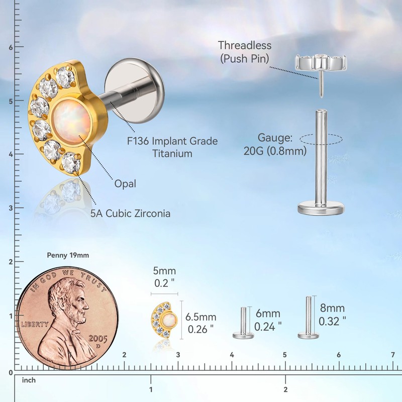 - Post Thickness: 20g=0.8mm, Post length: 6/8mm, 1pc packge: stud top × 1, 6mm post × 1, 8mm post × 1, Material: ASTM F136 titanium, Gemstone: AAAAA cubic zirconia, perfect for cartilage, helix, conch, tragus, lobe, rook, daith, nose piercing jewelry, etc.