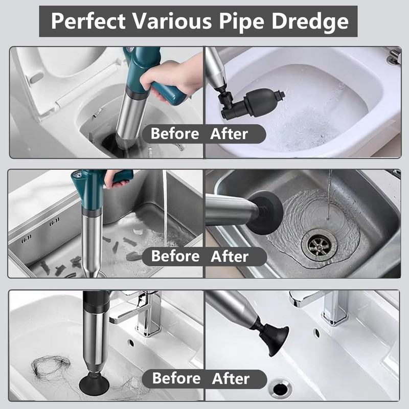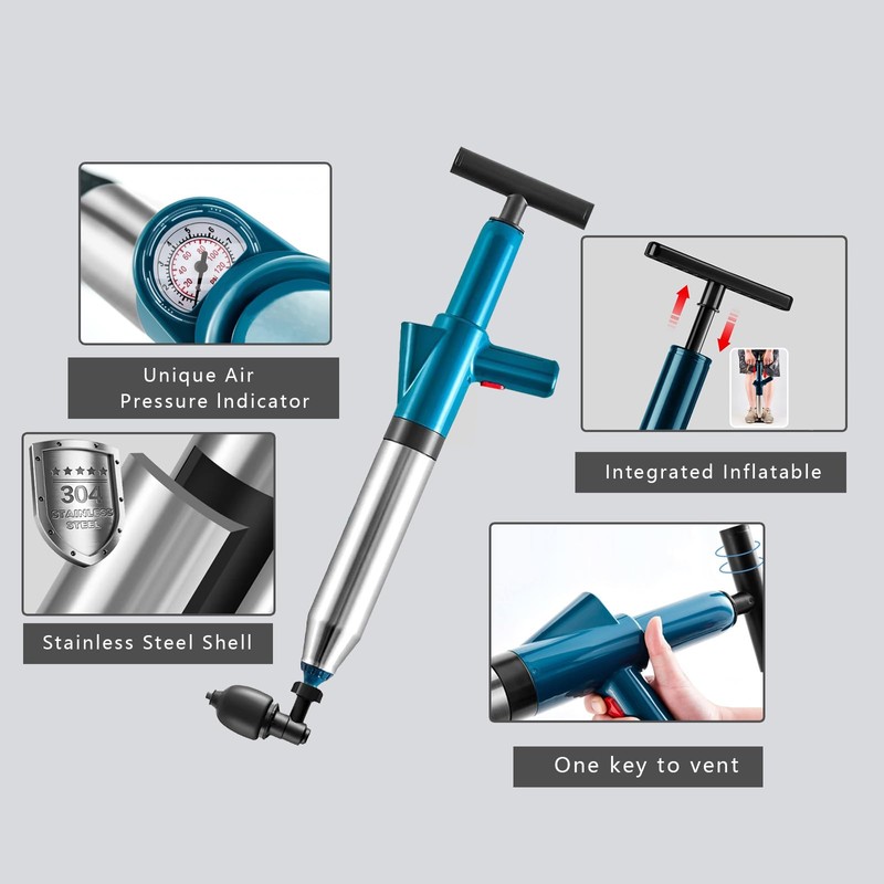 - 120 PSI Air Power – Real-Time Pressure Gauge for Safe Use Say goodbye to weak plungers! Our air plunger toilet clog remover delivers up to 120 PSI of compressed air, blasting through stubborn clogs in seconds. The built-in pressure gauge lets you control the exact force, ensuring safe, splash-free cleaning.