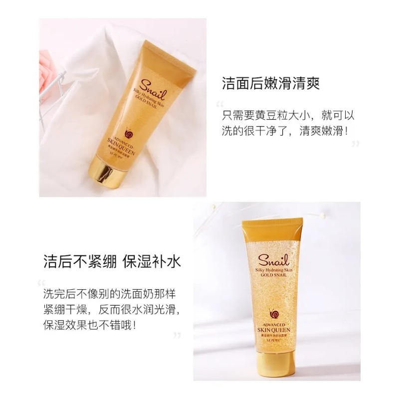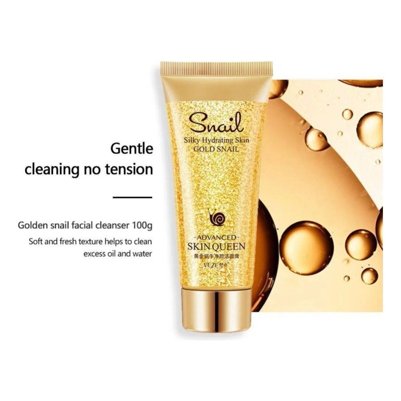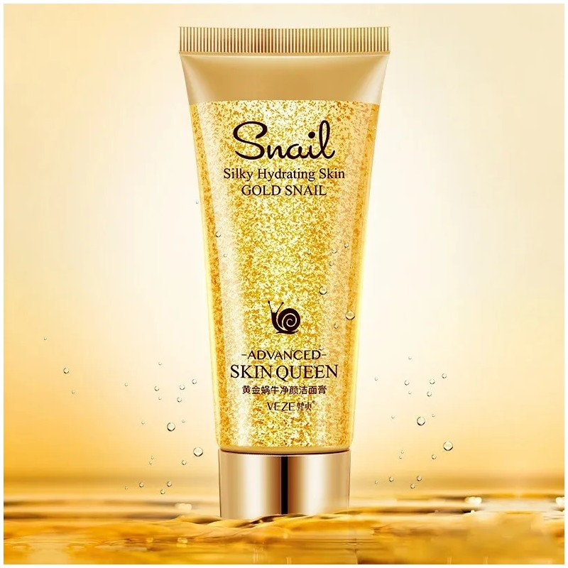 Una textura suave del gel con partículas doradas y una mucina de Caracol tiene como objetivo limpiar de la suciedad de varios formatos.
