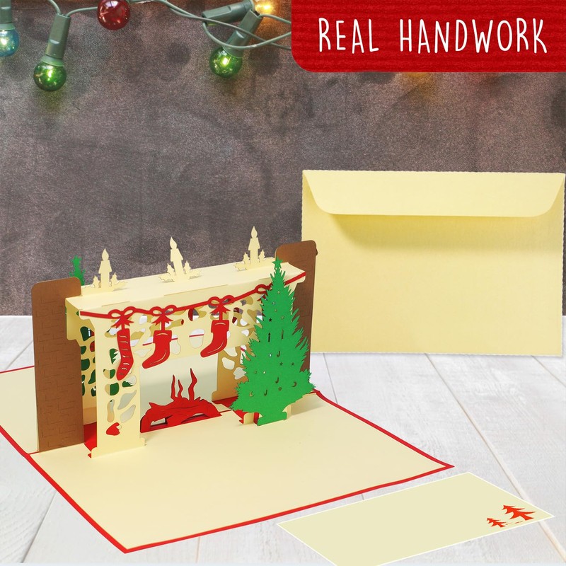 - Wow effect: No more unimaginative Christmas cards and boring sayings. When opening this pop-up card, a three-dimensional fireplace unfolds.