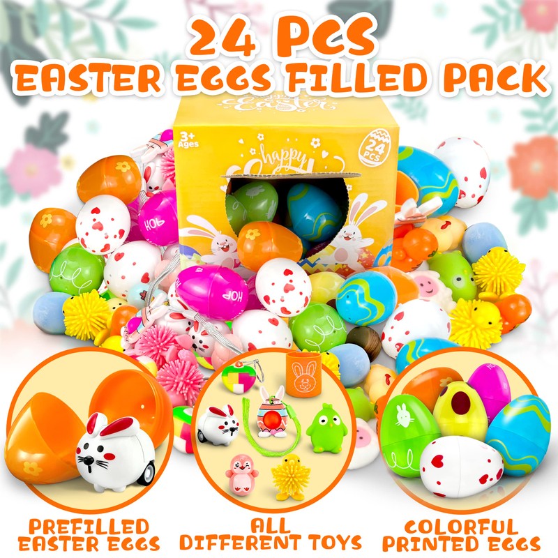 - SUPER VALUE EASTER EGGS PREFILLED PACK - Package Included 24 pack pre-filled Easter eggs with assorted toys. 24 PCS colorful printed Easter eggs filled containing a variety of fun children's toys, such as Kawaii Mochi Squishy, Pull Back Cars, Cute Easter Keychain, Sensory Fidget Toys, Wobbly Toys, etc. With a random toy in each colorful special Easter egg, kids will be delighted with the great surprises these Easter eggs bring!