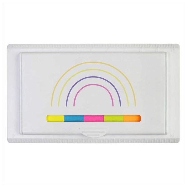 This sticky note ruler pad is a useful desktop accessory; the white plastic case has a flip top lid which reveals 7 colours of slim sticky note tabs. There are approximately 25 sticky notes in each colour, ideal for writing notes on and marking pages. Both edges of the plastic case are embossed with ruler markings; imperial on one side (0 - 4 inches) and metric on the other (0 - 10cm). Each case is printed on the flip top lid with a unique design, making it great gift for students and office workers.