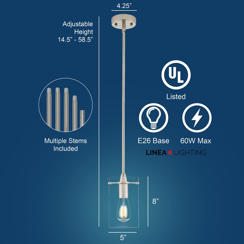- COMPATIBLE WITH MOST STANDARD MEDIUM BASE BULBS - This brushed nickel kitchen pendant light fixture comes with medium clear glass shade that has a diameter of 5" and a height of 8"