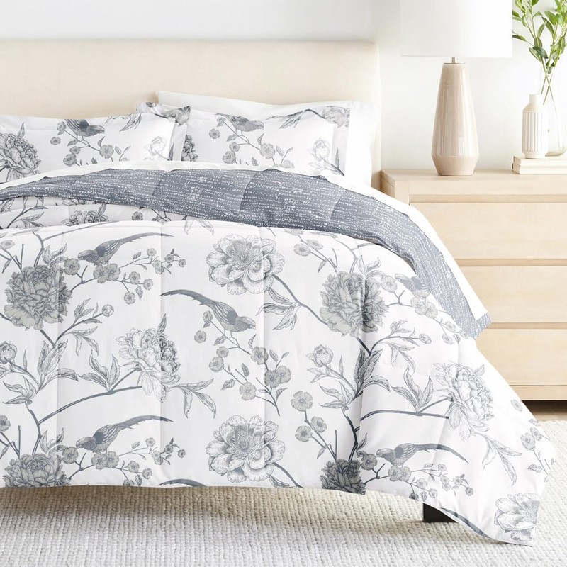 LINENS & HUTCH Bedding Bundle, Patterned Microfiber Comforter Set and Solid Sheet Set - Full Molly Botanicals Light Blue