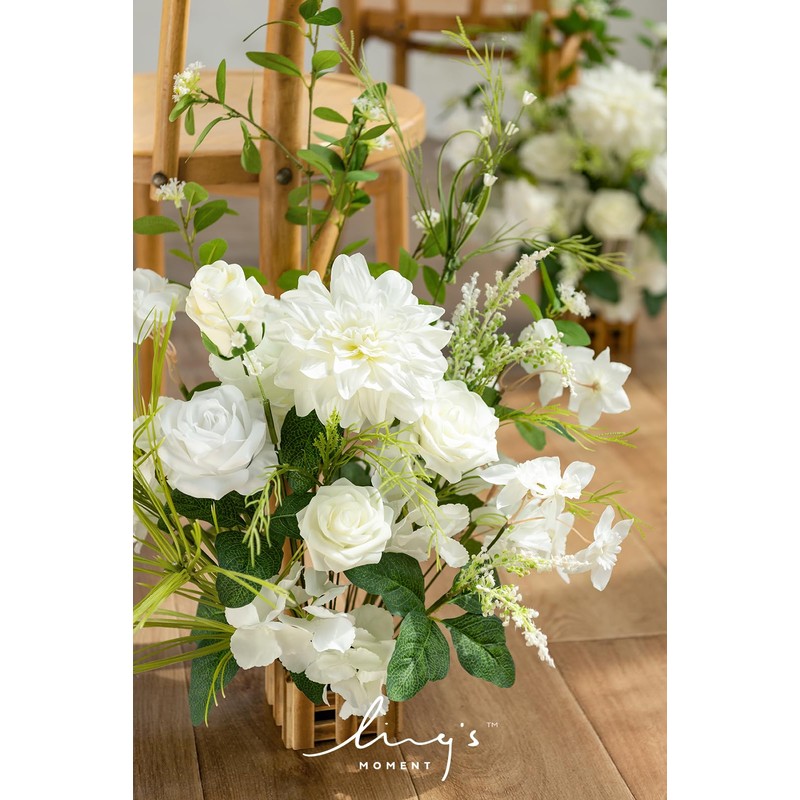 • SIZE: The dimensions of the arrangement are 17.5" in height and 10" in width. Please note that the aisle flowers may bend slightly during shipping and packing. To restore their shape, kindly refer to the product video and gently knead the wedding flowers.