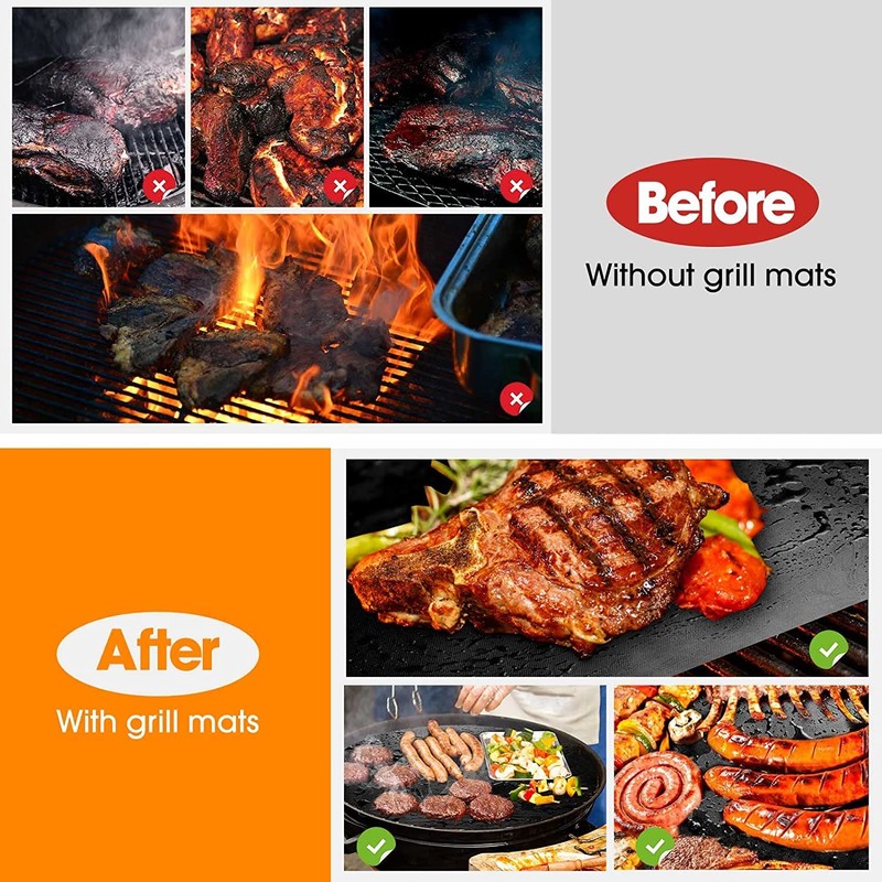 - 100% NON-STICK - 100% Non-Stick means you can grill without grease and mats are reusable for years! Non-stick BBQ grill mat prevent even the smallest morsels from falling through the grates. Keep your grill looking brand-new and no more clean-up of your dirty grill!