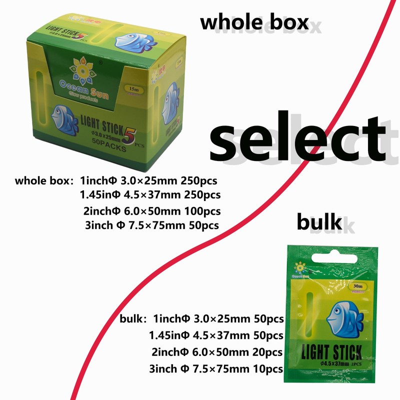 - it is fishing glow stick four size for 1Inch(3.0mm×25mm) 1.45Inch(4.5×37mm) 2Inch(6.0×50mm) 3Inch(7.5×75mm)