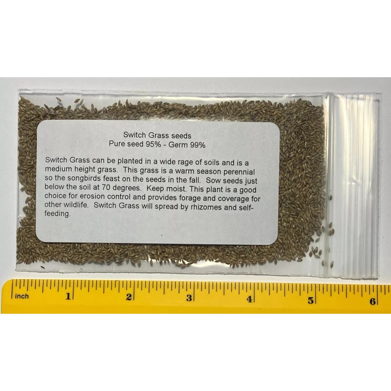 SWITCH GRASS. Original member of the native tallgrass prairie. Impervious to floods, fire and drought. Easy to grow from seed. Very hardy, down to -50F. Perennial with a long life span(10+yrs) Likes to form clumps about 1-2' around and will get 5+ feet tall. Not picky about soil, will grow just about anywhere with 6 hrs of sun. Has a grey/blueish hue in the summer and turns copper color in fall, giving some color to the winter landscape. Wildlife is attracted to switch grass. Deer and others hang out around stands of switch grass, it provides hiding spots and a safe place to bed down. Also makes a great security fence, always wear gloves, long sleeves and thick jeans when working with switch grass, this stuff will cut you up in short sleeves and shorts. Poisonous to horses, goats and sheep. But not to cows or humans. Will spread through rhizomes and self seeding. If using as a ornamental, cut down to 8"early spring for fresh new growth every year (wear gloves!).8000+ Quality seeds.