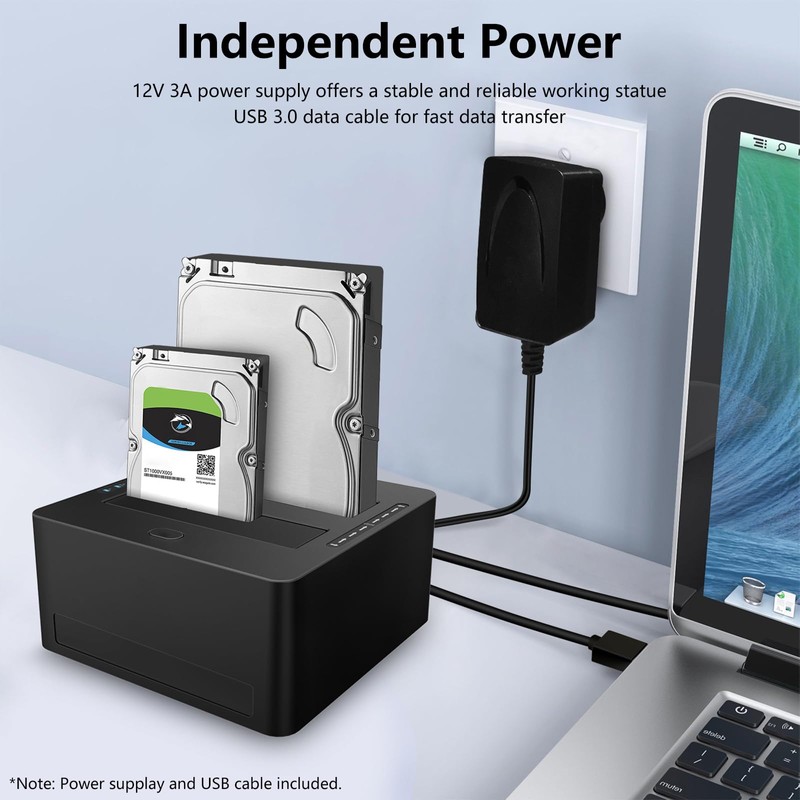 - Package List: 1*Dual-Bay SATA Hard Drive Docking Station, 1*USB 3.0 Cable, 1*12V/3A Power Adapter.