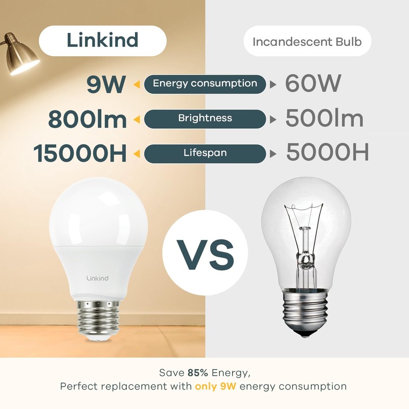 - Energy Efficient & Money Saving-- Adopting energy-efficient LED chips, Linkind non-dimmable A19 LED light bulbs save up to 85% on your electricity bill by replacing 60 watts incandescent light bulbs. They provide more energy efficiency but less heat output, making them a great alternative to 60W incandescent bulbs.
