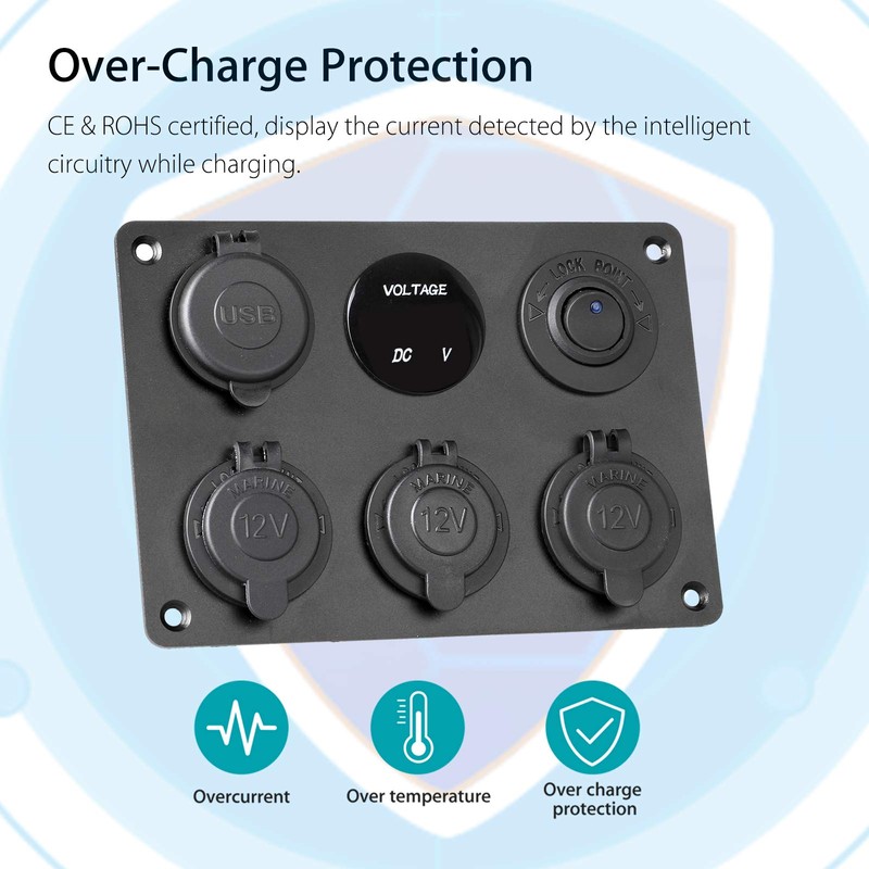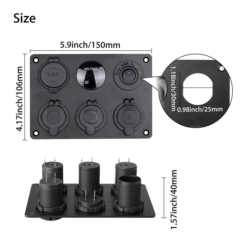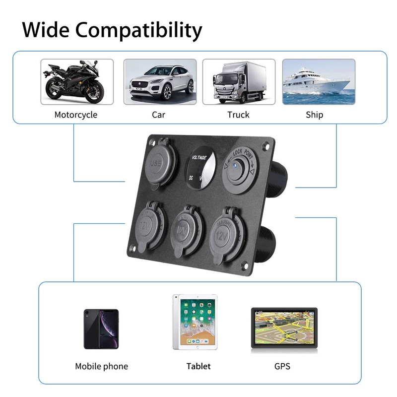 - 6 IN 1 MARINE PANEL:This 12V socket panel is designed with a 3-Socket 12v cigarette lighter outlet+ 12v rv USB outlet + LED digital display voltmeter + LED rocker toggle switch. Convenient for installation and operation. Also detachable to replace other charger sockets or anything else that fits.