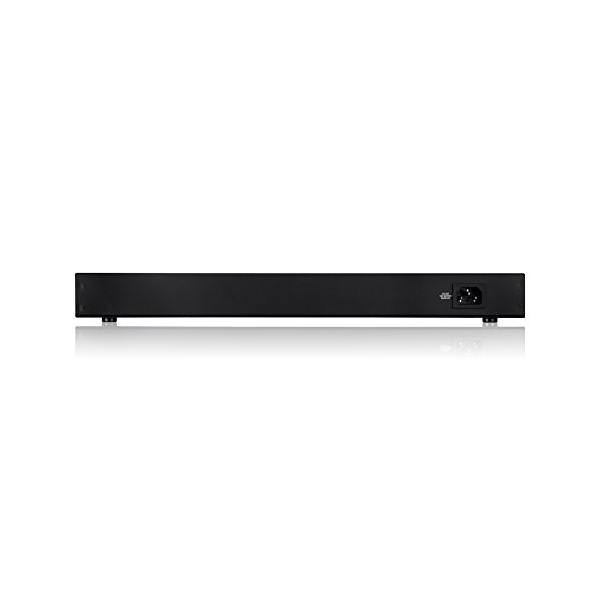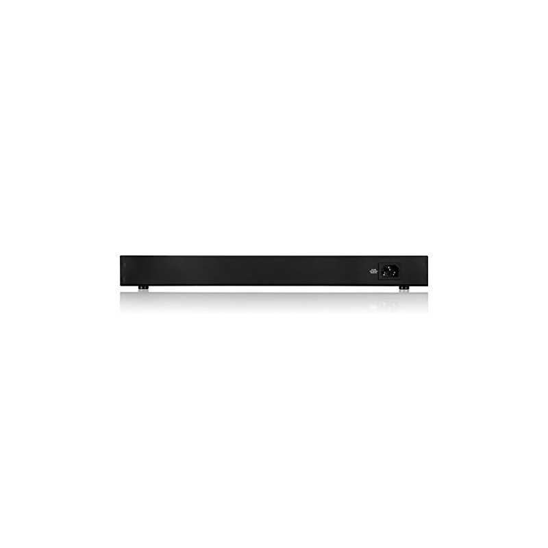 • 24 port switch with 12 PoE+ ports (ports 1–6 and 13–18) and dedicated PoE power budget of 120 W