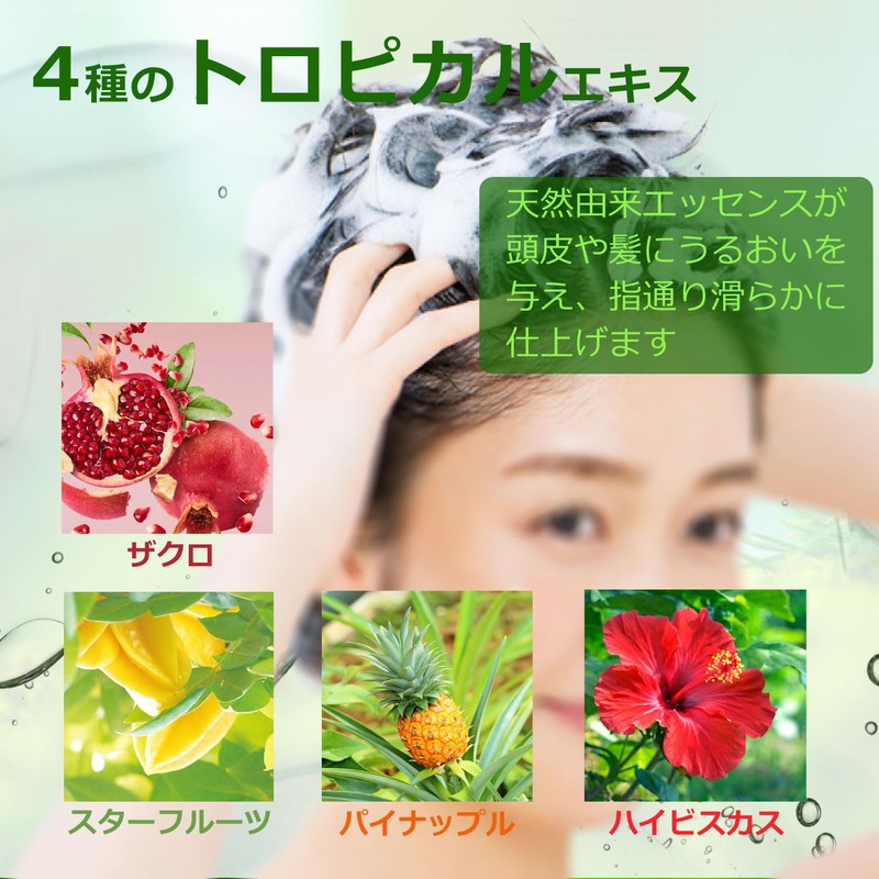 - ● 老舗酒造の恵み、酒粕エキス: 安政4年(1857年)創業の栽培醸造蔵「泉橋酒造」の酒粕をエキス化(保湿成分)して配合、頭皮や髪にうるおいを与え、ダメージから守ります。 ● 4種のトロピカルエキス: スターフルーツ葉・ザクロ・ハイビスカス・パイナップルエキス(保湿成分)を配合、天然由来のエッセンスが頭皮や髪にうるおいを与え、指どおり滑らかに仕上げます。
