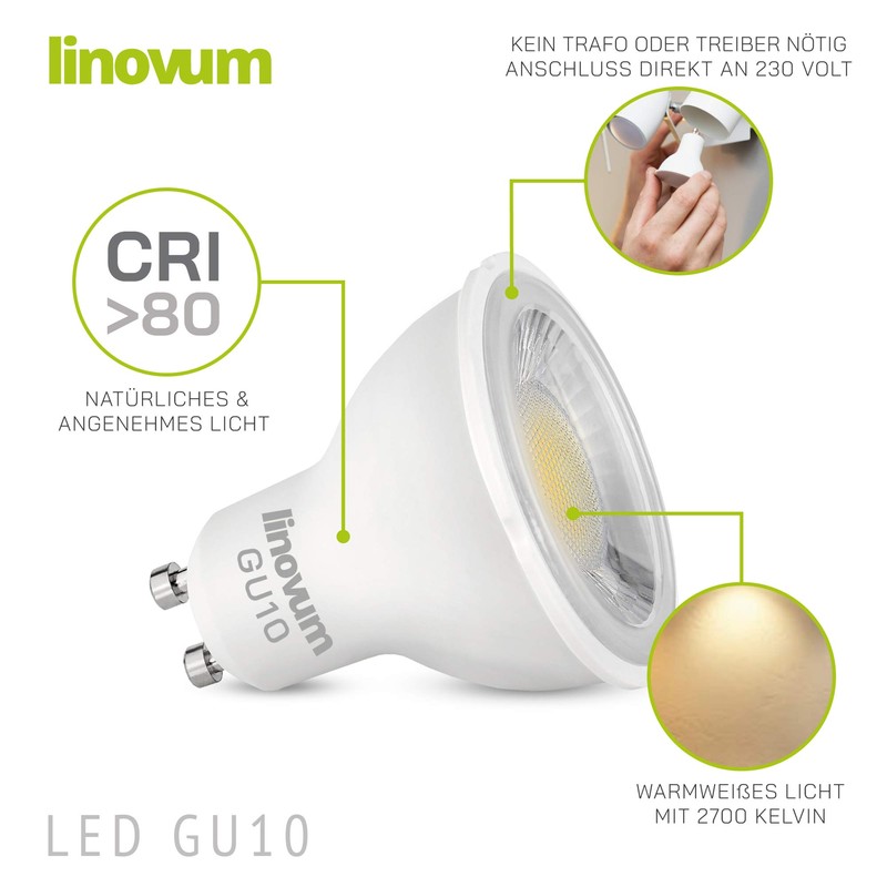 linovum Pack of 10 LED Bulbs GU10 Warm White 3 W Beam Angle 36° Replaces 35 Watt Bulbs 230 Volt Bulb Halogen Replacement