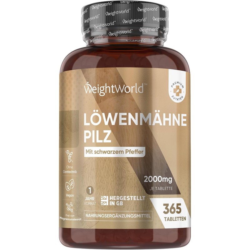 Lion Mane Mushroom 365 Tablets - 2000 mg per Tablet - Lions Mane Mushroom (Hericium Erinaceus) - 25:1 Extract with Black Pepper 30mg - 1 Year Supply - WeightWorld